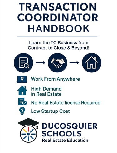 This Transaction Coordinator Certficiate Program offered by Ducosquier Schools is designed as professional development and skills-based training program. This course does not qualify as Florida Real Estate Commission (FREC) pre-licensing, post-licensing, or continuing education (CE) courses, and it does not meet requirements for state licensing. Certificate of Completion is issued by Ducosquier Schools as recognition of completing the training.