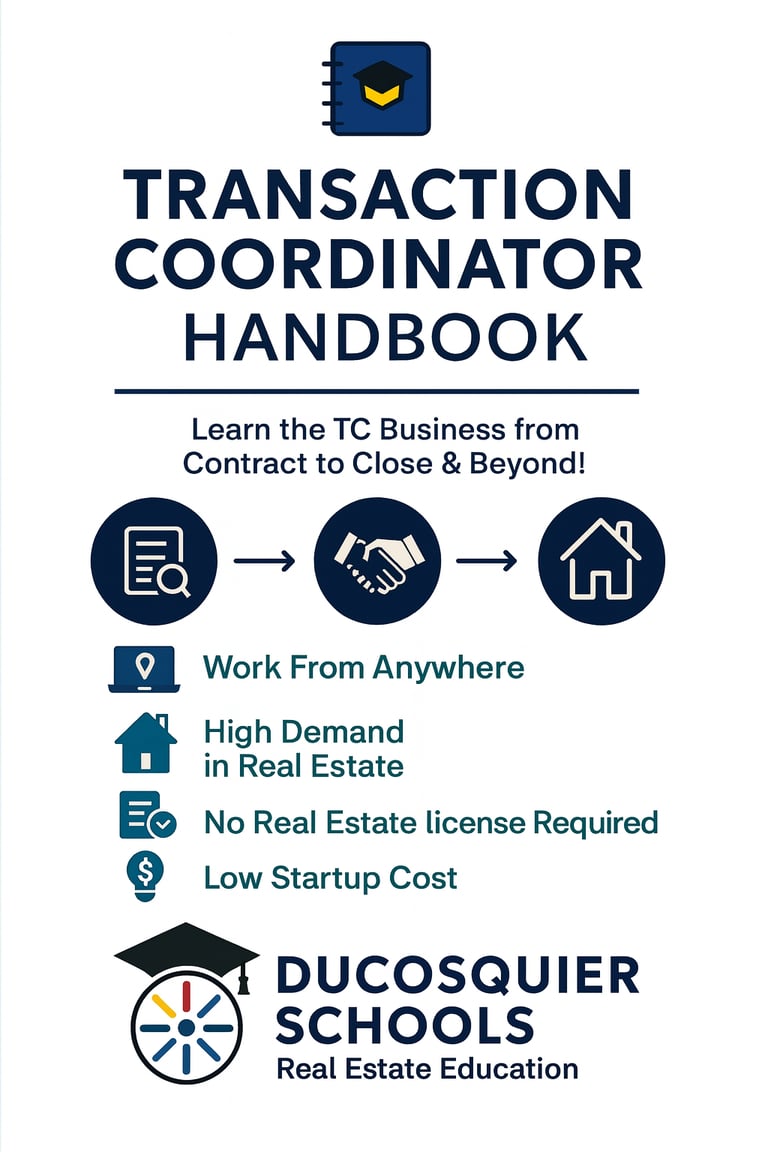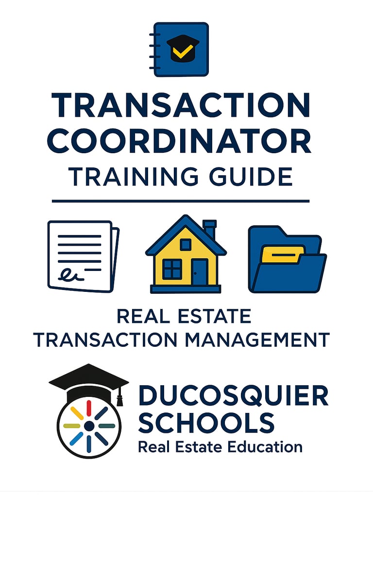 This Transaction Coordinator Certficiate Program offered by Ducosquier Schools is designed as professional development and skills-based training program. This course does not qualify as Florida Real Estate Commission (FREC) pre-licensing, post-licensing, or continuing education (CE) courses, and it does not meet requirements for state licensing. Certificate of Completion is issued by Ducosquier Schools as recognition of completing the training.